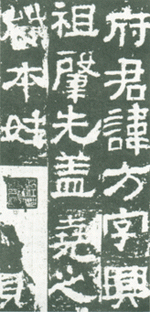 《衡方碑》(图为拓本局部),全称《汉故卫尉卿衡府君之碑》。此碑立于东汉建宁元年(公元168年)九月,是衡方的门生朱登等为其所立的颂德碑。该碑原立于山东汶上县,现藏山东泰安岱庙。碑高240厘米,宽110厘米。碑阳刻文23行,满行36字,计815字,字径4厘米,隶书。碑阴存题名两列,字已严重漫漶。碑额阳文隶书两行,共10字,为“汉故卫尉卿衡府君之碑”,字径9厘米,两行之间有竖格线。《衡方碑》存世所见最早拓本为明拓本,第六行“都尉将”之“将”字未损。