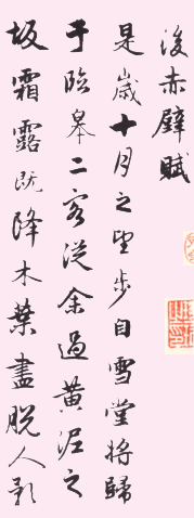 另外值得注意的是,《前后赤壁赋》为小字行书,结合创作实际及当前的展厅效应,它不适宜用来创作少字作品,如磅礴大气的对联和其他形式的少字作品。中堂、条幅(指六尺、八尺等大幅)也不宜写,因为竖式文字过长人们读来会感觉累,在章法处理上也会显得单调。