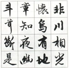 另外短竖在具体应用时也要随机而变,与整个字协调。如“幽”字中竖细挺,与旁边粗线条映衬,取得平衡;“地”字中两竖长短各异,令字态灵动;“光”字之竖起笔微曲,与下方平直的线条产生对比。