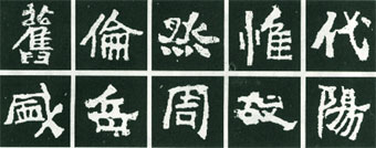 在撇画处理方法上,《嵩高灵庙碑》也有一些特殊形态,如图中“盛”字左侧的撇画自行笔至收笔处呈渐粗状,而后驻锋提笔,戛然而止。“岳”字撇画侧锋起笔,两端粗而中间细,起笔方,收笔圆。“周”字撇画收笔处方,没有撇画动作。“故”字中撇画更为特殊,已处理成点画。如果字形中有较多撇画,那么就必须进行变化。图中“阳”字撇画很多,但各不相同,可结合图例细加体会。像这样的变化依赖的是创作技法水准,只有技法高超,才能变化无痕。