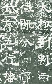 《嵩高灵庙碑》(图为拓本局部)又名《寇君碑》,北魏太安2年(公元456年)立,相传是为寇谦之撰书。寇氏为著名道学家,曾因向魏太武帝献道经而受宠幸。碑文内容为寇谦之修祀中岳庙并宣扬道教的事迹,不仅对了解中岳庙变迁有参考价值,而且具有极高的书法艺术价值。此碑书体自隶经楷,隶正相杂,尚无定法,许多地方还不成熟,有无以伦比的拙朴天趣。该碑用笔以方笔及中锋为主,笔画方棱,雄强奇古,与《张迁碑》一脉相承。其结构错落有致、真率古拙、大小不拘、富于变化,颇见自然之趣,旁与《爨宝子》、《爨龙颜》神理相通,然更富野逸天趣,历来为后世所推重。康南海将其碑阴列为“神品”,称碑阳书法“奇古”,碑阴书法“峻整”他在《广艺舟双楫》中评道:“《灵庙碑阴》如浑金璞玉,宝采难名。……如入收藏家,举目尽奇古之器。”他甚至说:“得其指甲,可无唐宋人矣。”该碑现存拓本残存文字及诸家释文均未见有关镌刻年月及撰书者姓名。