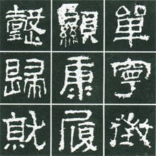 (五)左右对称,结体平正。包含两个方面的内容。一是结构的各个部分安排均匀。如图中“单”、“留”二字的几个部件安排得和谐匀称,无大起大落,上部两个部件,虽然写法有变化,但又不失隶书典雅的特征。二是笔画无突兀之态。如图中“归”、“康”二字,笔画提按含蓄,虽有粗细之别,但结合得十分自然,字的重心平稳。