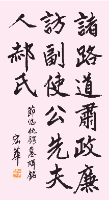 楷书中堂在书法创作中用得较多,不管是写什么风格的楷书作品,都可用来表现内容较多的作品,尺幅大,有气势,在书法展览和比赛中容易引起人的注意,如果在用笔、用墨、结字和章法布局方面再做一些有益的探索,充分吸收和借鉴前贤在楷书创作方面的成功经验,则会在创意上有较大的突破,形成自己的艺术特色。