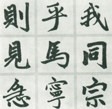 (6)横钩。如附图中的“宁”字。其书写方法是:接上笔顺势向右下轻落笔,接着向右横行笔,至右端时往下略按,再提笔向左下钩出。此钩宜短。在赵字中,尤其是在此帖中,还有一种横钩的写法,即书写至右端时轻按,然后折锋向下,收笔时向左方轻轻钩出,如附图中的“宗”字。