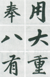 (2)竖撇。其形较正,中段微向右凹,收笔仍斜向左下,至末端驻笔向上出锋。此撇上部较粗重,下部轻细,但收笔时又极其有力,它多与竖画左右对称,如附图中的“用”字。