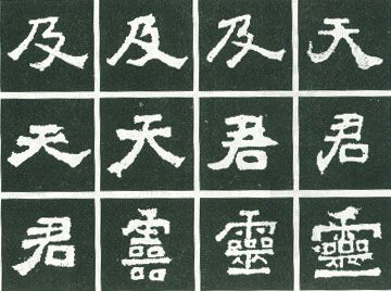3、“君”字。图中第一个“君”字“尹”部第三横右端伸出,与“口”部结合很紧凑,转折处圆中见方、浑融无迹,给人以稳如磐石的感觉。第二个“君”字“尹”部撇画末端出钩,且和“口”部稍有错位。第三个“君”字三横画自上而下逐渐伸长,形成梯状的层次变化,字形歪斜欲倾,通过“口”部来调整和平衡整个字形重心。