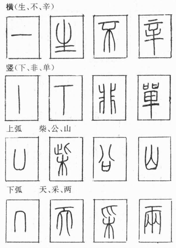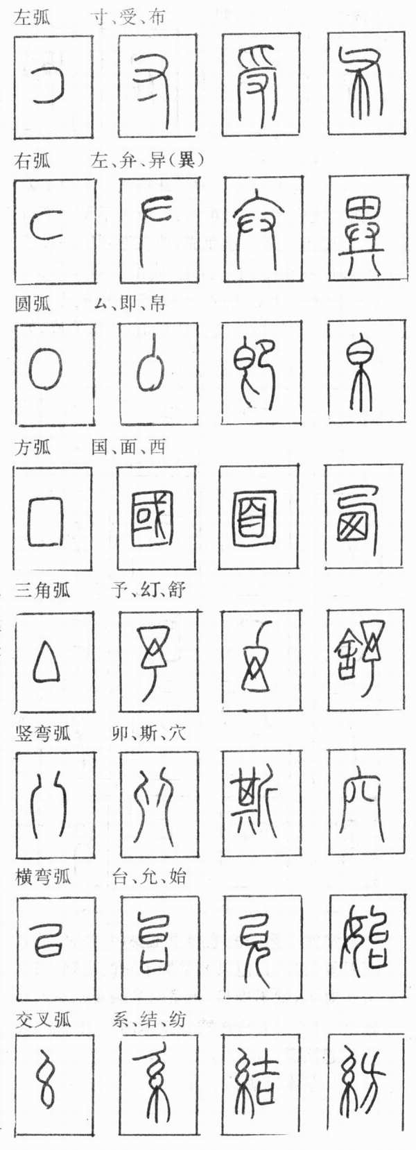 小篆的点画一般用短横、短竖和各种变化的弧来表现。小篆的弧有上弧、下弧、左弧、右弧、圆弧、方弧、三角弧、横弯弧、竖弯弧、交叉弧和连绵弧等。如下图所示:
