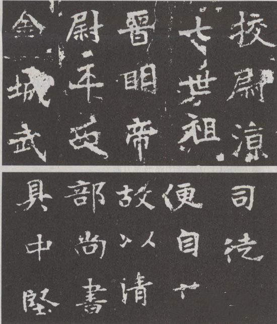 《张猛龙碑》(附图上者为拓本局部)的主要特点可用“险峻”一词来概括,属魏碑中风格突出的一类。其大多数字欹侧取势,笔画结构夸张,整体气势奇崛。相比而言,《郑文公碑》无疑属于平正一路。但在稍后进行的结体分析中,我们也不难看出,《郑文公碑》其实也极为注
