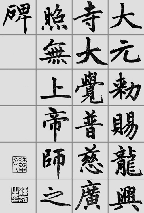 为了适应书写碑版的需要,赵孟 又在“二王”系统里找到了“碑版照四裔”的李邕(北海),增加了他楷书中的朗朗风骨,更显出“丰丽遒逸,内骨停整”的面貌。“其学李北海,殆如玉环之于飞燕,虽任吹多少,而《霓裳》一曲,足掩前调”(明王世贞《 州山人稿》),形成了碑版书的独特面貌。