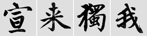 ①横钩。《胆巴碑》中的横钩多用侧锋,并折中含转。其用笔方法是,逆锋向左上起笔,转而向右渐提行笔,至钩处渐按,转锋向左下钩出。如图一中“宣”字的钩画。
