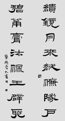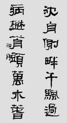 来楚生不但把简书应用于书法创作之中,而且还应用在篆刻创作上。从他的印作中,我们可以看到汉简对其刀法和章法皆有很大影响。在书法创作方面,来氏将简、隶熔为一炉。他早年曾偏爱金农早期的隶书,与汉简有一种“默契”之情。此处所选对联(见附图右者)写的是刘禹锡诗。该联字形间架有《张迁碑》的影子,用笔源于汉简,结构熔篆、隶、简于一炉,打破平正,不守故常,可见来楚生对简书有深刻而独特的理解。(34)