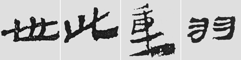 “毕”、“落”两字笔画粗细大致均匀。而图三中的“世”字末笔收笔时有明显的提按动作;“此”字收笔用力铺毫,提笔省略了滑行动作。如果在字形中有多笔平行的笔画,则必须注意变化,如“重”字横画较多,各不相同,巧妙之处在于将“田”部左移,最下方横画右侧较为粗重,从而在险绝中建立了整个字形的平衡。“羽”字左右两部分相同,但起收笔无一相似,各有变化,可谓“毫厘之变,尽显风神”。(3)