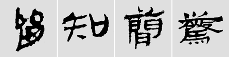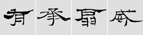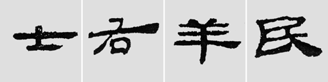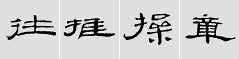 汉简书风特殊之处在于来源驳杂,风格随意。一方面,它包含了浓重的篆书遗意,有高古风韵;另一方面,汉简出自民间工匠之手,因而又带有随意简便的色彩。我们在临习汉简时要注意把握这个特点。图四一组字中,前两字保留了篆书的轮廓,在笔顺上皆非后世隶书书写的正常笔顺。而第三字“ ”的草字头写成对点加一横,第四字“惊”字“马”部下方四点只作三点,显得随意至极。这些用笔如果运用到行书创作中,也能产生美不胜收的效果。(2)