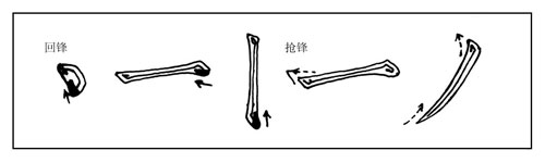 抢锋:也称作“虚抢”、“空抢”,是露锋起笔和露锋收笔时采用的运笔动作。即在露锋起笔时先在空中作一个藏锋动作,然后再入纸作笔画的起笔。在露锋收笔时,也按有往必回、无垂不缩的要求把锋在空中回缩。(见图二)