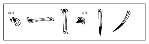 藏锋:是指起笔而言,当某一笔画起笔时,笔锋先向相反方面逆行,待笔锋“折”或“转”后再写笔画。起笔处笔锋藏在画内,使之不露痕迹。(见图一)