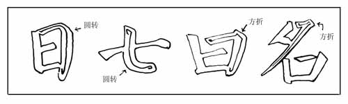 方笔和圆笔:有棱角者为方,无棱角者为圆。方笔用折法,其特点斩截爽利,具有张力;圆笔多用转法,其特点圆劲饱满,外柔内刚。(见图四、图五)