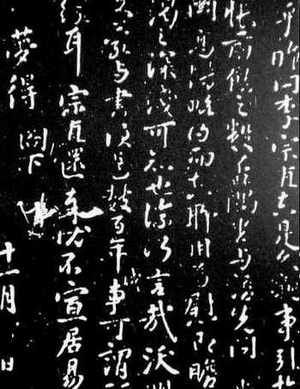 《与刘禹锡书》(如图)为行书尺牍拓本,共37行,字迹虽漫漶,亦显出晋唐风韵,结字朴实平白,一如其诗,绝少修饰。大小错落,彰显气度,章法绵密,若满目天星,温润祥和。书卷气蓊蓊郁郁,扑面而来;品味之,觉其旁掺右军,兼及鲁公,与虞世南《汝南公主墓志铭》、褚遂良《枯树赋》颇相类。白居易善书,称其为书家,在宋代已得到肯定。《宣和书谱》谓:“观其《丰年》、《洛下》两帖与夫杂诗,笔势翩翩。大抵唐人作字无有不工者,如白居易以文章名世,至于字画不失书家法度,作行书妙处,与时名流相后先。”白居易诗格平实简易,大朴不雕。读者明白晓畅,心豁神明,略无滞碍。书风亦如文风般雅素洁净,有虞永兴之萧散洒落,褚河南之遒逸飞动,不失唐法规矩,风骨内敛,精神外拓。白氏书风,温雅中有雄健,魏晋风流,神气爽爽,超逸优游。兼具右军之冲和、子敬之神骏。白居易的书法风格与他的一生经历有关:他任江南宣城太守,杏花春雨的滋润,小桥流水的细腻均在腕底;元和间贬江州司马,开始了平白简易的文风,其书亦不求奇异,晓白易认。
