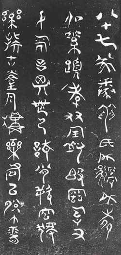 傅山的这种“真率”、“自然”的境界是建立在学习传统书法,特别是篆隶的坚实基础之上的。“楷书不自篆隶八分来,即奴态不足观。此意老索即得,看急就大了然。所谓篆隶八分,不但形相,全在运笔转折活泼处论之。俗字全用人力摆列,而天机自然之妙竟以安顿失之。按他古篆隶落笔,浑不知如何布置,若大散乱而终不能代为整理也。写字不到变化处不见妙,然变化亦何可易到。不自正入,不能变出。但能正入,自无婢贱野俗之气。然笔不熟不灵,而又忌亵,熟则近于亵矣。志正体直,书法通于射也。元阳之射而钟老竟不知,这不亵之道也,不可不知。”④傅山在对古代金石碑版资料广泛收集整理的基础上,极力推崇金文篆隶书法,从而成为碑学建构的先导。他说“不知篆籀从来而讲字学书法,皆寐也,适发明者一笑。”“楷书不知篆隶之变,任写到妙境,终是俗格。钟王之不可测处,全得自阿堵。老夫实实看破地,工夫不能纯至耳,故不能得心应手。若其偶合,亦有不减古人之分厘处。及其篆隶得意,真足吁骇,觉古籀真行草隶,本无差别。” ⑤