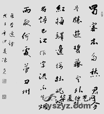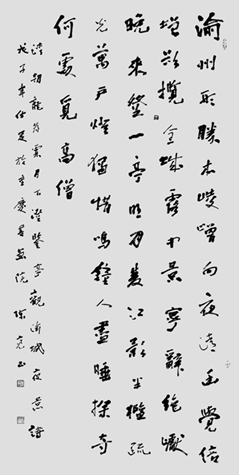 中国书法的历史长河能生生不息地流淌至今,最重要的就是创新发展。书法创新在于发现自我、塑造自我,创作出具有时代审美内涵和艺术情趣的作品。在陈亮创作的《龙为霖渝城夜景诗》作品(见左图)中,虽然还具有传统的用笔和结字法则,但是在线条造型和风貌取势上已注入了新的活力,个性风格跃然纸上。其用笔以圆施方,中侧生焉;线条提按变化,或“重若崩云”,或“轻如蝉翼”;结体大小、疏密有别;取势欹正错落,纵敛开合,特别是在布局立意上选择散淡方式,字距与行距都拉得很开,字字相对独立,极大的空间感带给欣赏者一种月朗星稀、宁静深远、气息通畅、空灵若谷的美感。