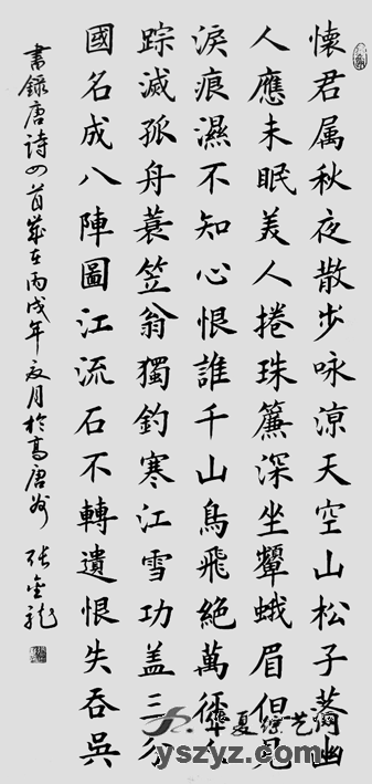 ? ?? 张金龙的书法作品,首先打动人的是其中那种浓重的古典情怀。我曾见他所临《圣教序》,深感其对传统的浸淫之深。张金龙幼承家学,悉心临帖,从“二王”、欧阳询、赵孟 等一路写来,师物学古,不为所囿。他真、行、草、隶、篆无所不涉,尤以行、楷见长。古人云:“楷书须如文人,草书须如名将,行书介乎二者之间,如羊叔子缓带轻裘,正是佳处。”张金龙的书法即有此气质。细观他的这件《录唐诗四首》(见图),笔精墨妙,端丽中见活泼,酣畅中寓遒劲;气息雄健清润,格调雅逸醇和。他通过笔墨再现了自己心灵深处涌动的情思,把自己的艺术感受升华为一种意味深长的表达,升华为一种对神韵的追求。用他的话说:“形为先,神韵超乎其表;神韵为主,寓于形,融为一体。若有形而无神韵,神采即脱格矣。故应形神兼备,神似胜于形似。”这种思想上的大彻大悟,使张金龙从根本上涤除了世俗气,因而他的创作,应该能够经得起历史的审视。