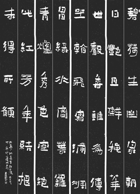 起初,得知家喜获奖,为他激动之余,脑子里面就一直在想象那件作品的模样。及至走进九届“国展”大厅,一派眼花缭乱的景象。家喜的作品排得很靠前。那是一件用墨染黑的洒银纸上以金粉书就的隶书四条屏,单屏双行,行六字,所书内容是李白的一首咏荷诗。末屏以两字的空间落下两行小行书款,我与此作“对话”良久,不禁惊呼“叛变”。