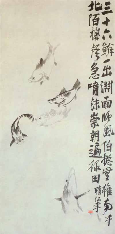 我们现欣赏的《游鱼图》(见右图)是李方膺的代表作。此作为纸本,设色,纵123.5厘米,横60厘米,故宫博物院藏。图中画五条大小不一的鱼,造型准确,动态各异――或奋力腾空,或徘徊环绕,或昂首前进,或逐浪而行,或傲对霜天。它们组成了一条反“S”形曲线,既有一种形式美,又强化了画面的动势。画家虽没画一滴水,但却营造出一种海阔凭鱼跃的景象。