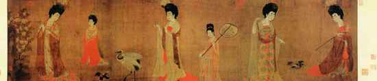 唐代作为封建社会最为辉煌的时代,也是仕女画的繁荣兴盛阶段。中国古代仕女众生像,“倾国倾城貌,多愁多病身”,唐代仕女画以其端庄华丽,雍容典雅著称,《唐宫仕女图》展示着“回眸一笑百媚生”的唐代美女众生像。其中最杰出的代表莫过于张萱的《虢国夫人游春图》、《捣练图》和周 的《簪花仕女图》、《挥扇仕女图》以及晚唐的《宫乐图》。它们所表现的贵族妇女生活情调,成为唐代仕女画的主要艺术特征。