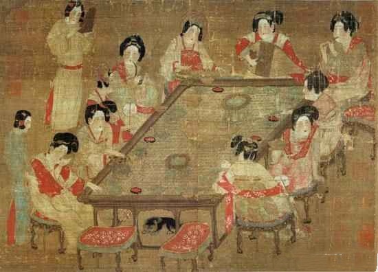 本图描写後宫嫔妃十人,围坐於一张巨型的方桌四周,有的品茗,也有的在行酒令。中央四人,则负责吹乐助兴。所持用的乐器,自右而左,分别为筚篥、琵琶、古筝与笙。旁立的二名侍女中,还有一人轻敲牙板,为她们打著节拍。从每个人脸上陶醉的表情来推想,席间的乐声理应十分优美,因为连蜷卧在桌底下的小狗,都未被惊扰到!