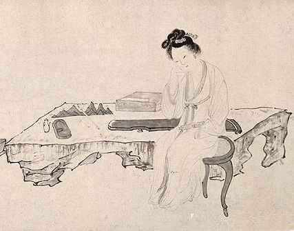 图中女子武陵春的面部和衣纹均以细匀的淡墨线条绘成,只在眼眸、发髻处用重墨点染,这种特殊的用墨方法不仅形成了生动的墨韵,同时也令画面清雅秀润,更贴切地表现出女主人的纤秀文静之美。此外,吴伟在创作上还采用了借物言志的艺术手法,以石桌上陈设的琴、笔、砚等文房用具揭示出武陵春内在的文化修养,以石桌左侧的盆景梅花象征武陵春心志如梅的高尚情操。以这些带有寓意性的物品作为衬景点缀画面,无疑在充实武陵春形象的同时也丰富了画面的视觉感受。吴伟凭藉其精湛的艺术造诣曾分别于明成化和弘治年间奉召进京供奉宫廷。他性情孤傲,不慕权势,为朝廷内外的恶浊环境所排斥。返回江南后,他常以饮酒狎妓遣释郁闷的心境,所以,他对青楼女子的生活有一定的接触和了解。当他闻知富有文采的武陵春身在青楼而不受所处境地的影响、对爱情忠贞不渝时,为之深深感动,遂援笔作此图,以示对武陵春的同情与敬仰。清吴麒《图绘宝鉴续纂》认为吴伟“画人物落笔健壮,白描尤佳”。此幅便是吴伟晚期白描画中的精品。吴伟的白描人物宗法唐代吴道子和宋代李公麟,强调线条自身婉转流动的韵律感和塑造形象的精确性。