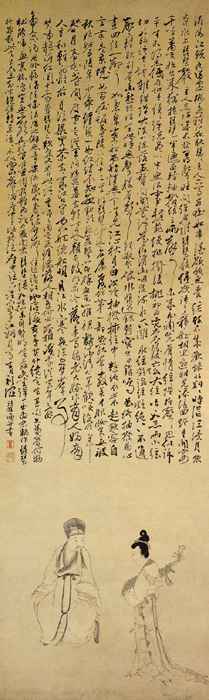 此图运用工笔白描法,端坐的白居易和抱琵琶侧立的商女,均以细秀流畅的兰叶描勾出,比例合度,情态细致,风格清新淡雅,毫无狂态和逸笔,属于郭诩比较工细的一路画法。然亦透出画家对简逸的追求,如在情节铺叙方面,省却了环境和陪衬人物,着意刻画两位主角,并突出“千呼万唤始出来,犹抱琵琶半遮面”时的情态,笔简而意完。
