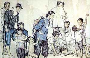 1943年10月29日,观众在太庙大殿(后改为北京劳动人民文化宫)看到了一幅后来成为中国世纪经典的作品——《流民图》(展览时的题目为《群像圈》)。这是蒋兆和在抗战时期最符合题材“抗战化”与技术“西洋画”的一幅作品。《流民图》高2米,长近20米,全图100余个人物形象,显示了作者宏观上把握矛盾冲突、把握社会现象的构思才能和水墨人物画方面的创造精神。