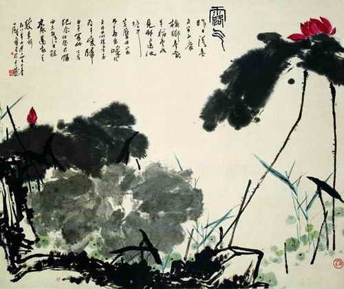 1958年6月18日潘天寿被苏联艺术科学院聘为名誉院士,7月14日作此画。《露气》构思新异,布局有出奇制胜之美。画面左上方以题识形成一长方形结构并钤以印章,使全局有起承转合的韵致。该画并未渲染露气,而用酣畅淋漓的笔墨点出了清露弥漫的气氛。题识:“昨日清晨至半山康桥乡参观早稻丰收,见村边池塘中芙蕖壮茁,如华岳峰头玉井中所植者,至为可爱。归后即写此以为纪念,但限于幅面,未能得其粗豪蓬勃之致,奈何。五八年七月十四日大暑,大颐寿者于止止堂。”“止止堂”为作者杭州住处画室之名,意在告诫自己荣誉面前须止步