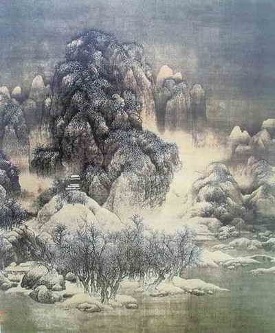 范宽尤善用积墨法,从《雪景寒林图》中我们看得更为清楚。《雪景寒林图》由三幅条绢拼成,画群峰屏立,山势嵯峨,苍润雄伟,山头遍作寒柯,深谷寒柯间,萧寺掩映;下作结林深邃,后有村居,一人张门而坐;板桥寒泉,流水萦回。整幅气势雄浑,境界深远,层次丰富,真实地表现了山川初雪的景象。山间雾气的弥漫和树石的坚实感,对比鲜明,更强化了画面意境的幽静、雄壮、浩莽。笔墨浓重润泽,皴擦多于渲染,层次分明而浑然一体。