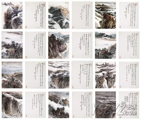 陆俨少作为“中国最后一个文人画大家”(唯一被美国纳尔逊博物馆定位),一生不求闻达,淡泊名利,致力于品学修养,开创了“陆氏云水”的新程式。“读万卷书,行万里路”、 “画山水必须到山水中去”,这是陆俨少的一贯主张,恰与杜甫“读书破万卷,下笔如有神”(《奉赠韦左丞丈二十二韵》)不谋而合。陆俨少曾在《俨少自叙・十 五》中这样说道:“我自度禀赋刚直,表现在笔墨上,无婉约之致,是诗境而非词境。”因此,陆俨少专意于古诗意画,不仅是自身对古诗词的热爱、熟悉和表现的 欲望,更是陆俨少的绘画气质与诗歌气质的内在对应。陆俨少从小爱读诗书,尤爱杜甫的诗,这其中不乏有性情气质相合的因素。他自己曾说:“我好杜诗,或亦禀 性相近,笔墨多有郁勃之气。”陆老在《陆俨少自叙》中也提到,当年在避难四川,“入蜀前行李中只带一本钱注杜诗,闲时吟咏,眺望巴山蜀水,眼前景物,一经 杜公点出,更觉亲切。”尽管如此,陆俨少以杜甫诗意创作的画册却不多见,更为难得的是对开自题,此本堪称陆氏册页中的精品之作。
