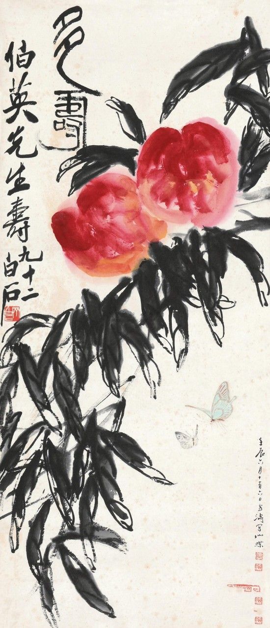 齐白石、王雪涛《多寿图》:此作为齐白石先生晚年的作品。图中中色、墨的使用可谓信手拈来,既热烈又沉着,既浓艳又和谐。两颗大桃施以鲜艳而饱和的洋红,先以没骨大写意法直接用洋红泼写硕大桃实,渗以少许柠檬黄,具有鲜明的民间艺术特色;细长的桃叶则用花青和赭墨写出,并用浓墨勾勒叶筋;笔墨上淋漓洒脱,奔放自如,生动活泼。衰年变法后的齐白石形成了属于自己的笔墨风格,单纯却不简单、真率而不粗俗、热烈而不痴狂、鲜明而不华艳。题材上他以丰富的生活经验,“为万虫写照,为百鸟传神”,歌颂生活中一切美好的东西,实为雅俗共赏。