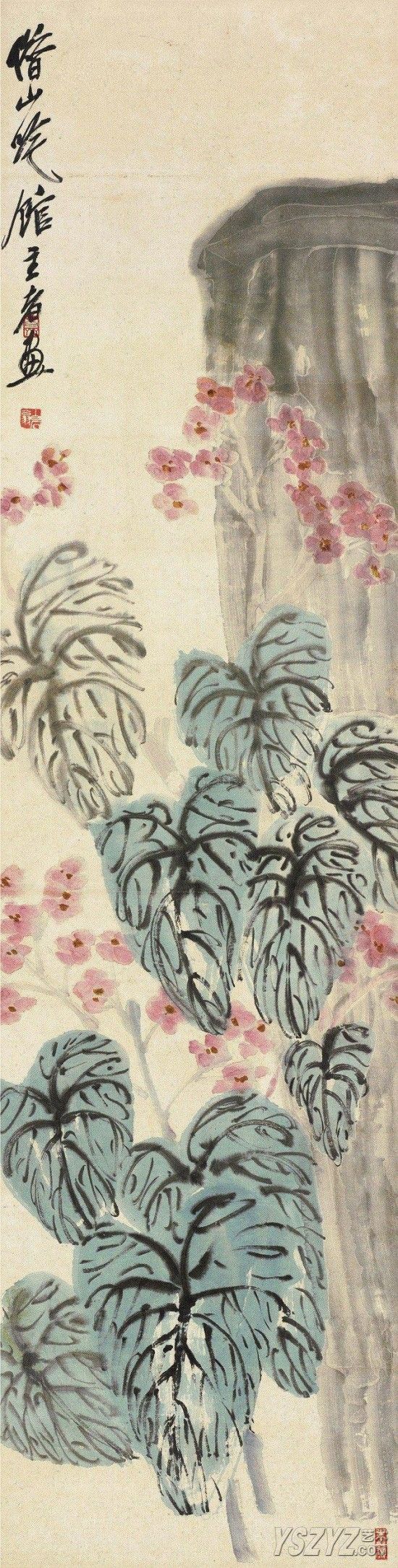 齐白石《繁叶顽石》:此作以寥寥数笔绘画出山石做为背景,水墨淋漓的用笔潇洒大方。前景以大写意手法绘画繁叶红花,茂盛浓密的布局,繁而不乱极富笔墨情趣。