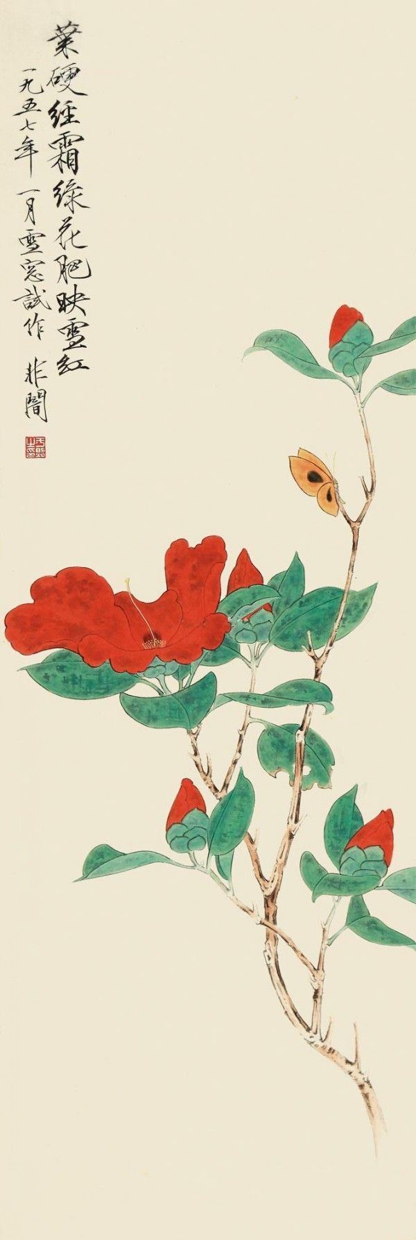 于照《花肥映雪红图》作品介绍:纸本,镜心,设色;纵80厘米,横26厘米;作于1957年;藏于不详;款识:叶硬经霜绿,花肥映雪红,一九五七年一月雪窗试作,非。钤印:于照之印。