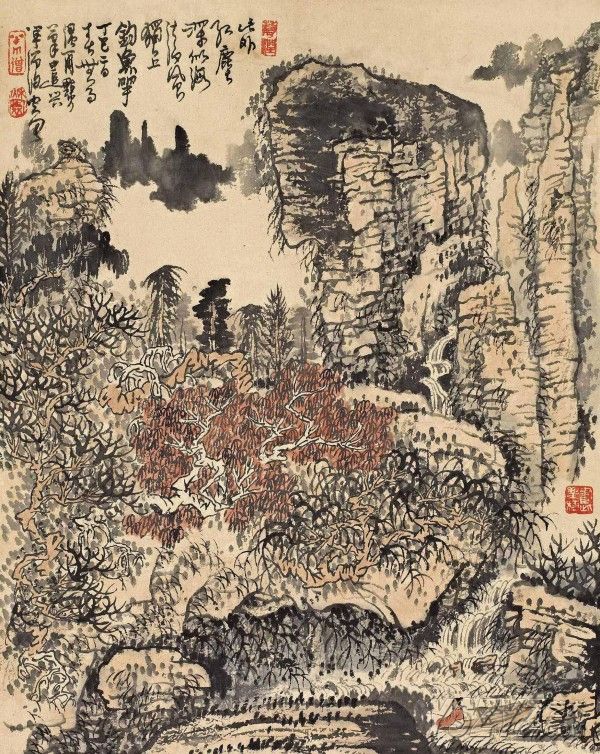 黄秋园《青峰独钓》作品介绍:纸本,立轴,设色;纵65厘米,横51.5厘米;作于1977年;藏于不详;题识:此外红尘深似海,清风独上钓鱼竿。丁巳二月春无事,偶尔点笔遣兴,半个僧画;钤印:半个僧、秋园、苍润、画此乐极。