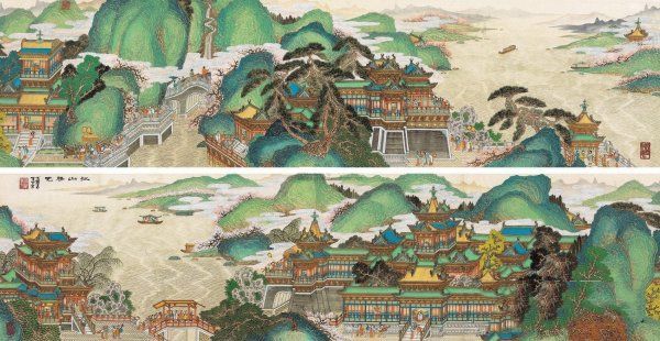黄秋园《江山胜览》作品介绍:纸本,镜心,设色;纵33.6厘米,横226.2厘米;藏于不详;款识:江山胜览。大觉子画;钤印:秋园、清风老人、烟霞供养、秋园之画。