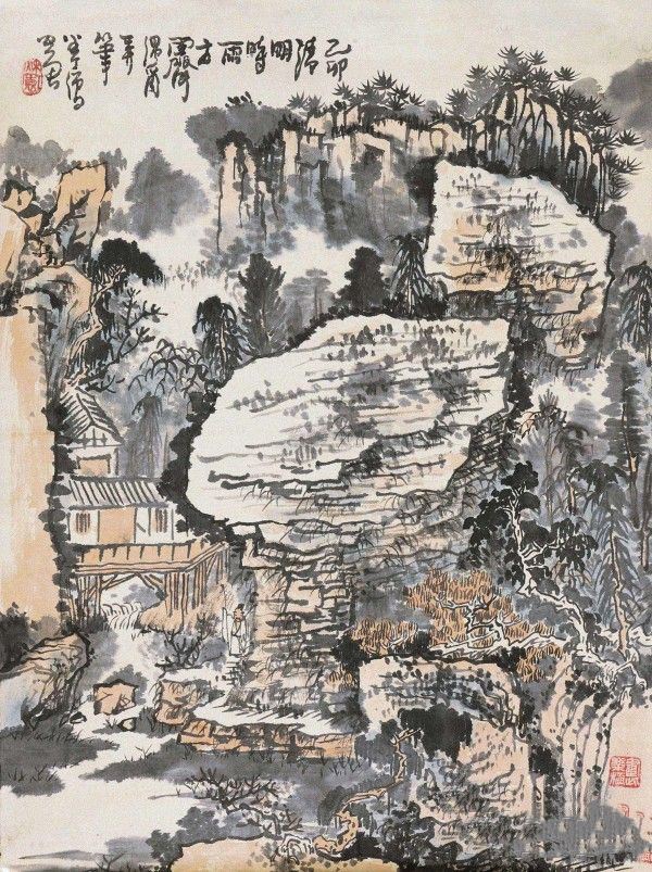 黄秋园《清明时节》作品介绍:纸本,镜心,设色;纵65厘米,横49厘米;作于1975年;藏于不详;款识:乙卯清明,时雨方霁。偶尔弄笔。半个僧画;钤印:秋园、画此乐极。