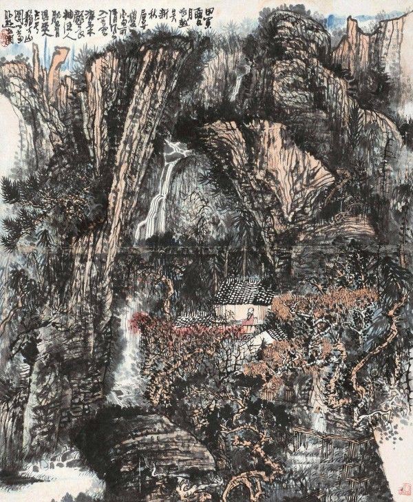 黄秋园《秋山图》作品介绍:纸本,立轴,设色;纵100厘米,横80厘米;作于1979年;藏于不详;题识:甲寅夏月甚热矣,新秋屡获雷雨,清风入山谷处,凉气袭袖,使人肌骨俱爽,己未写大山图以当卧游。秋园;钤印:大觉子、画此乐极。