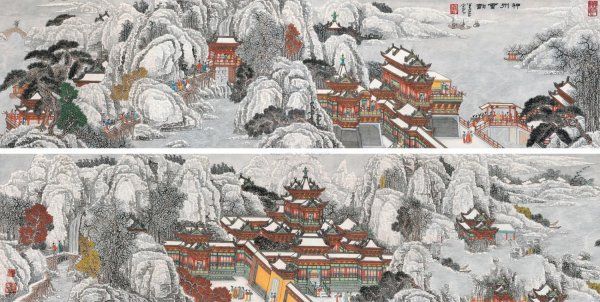 黄秋园《神州雪韵》作品介绍:纸本,镜心,设色;纵33厘米,横265厘米;藏于不详;题识:神州雪韵,秋园画;钤印:秋园之画、画此乐极、清风老人、烟霞供养。