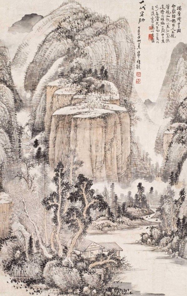 黄秋园《溪屋读书图》:中峰峦层叠,草木丰茂。主峰高耸壮阔,用淡墨披麻皴,表现出南方山峦土多石少的厚重质感。前方堆叠的绝壁兀然而立,崖顶杂树丛草稠密,布置精心,与远山渐进相融,绝壁上草木偃伏,似有微风徐徐吹过。峰峦开合处烟云弥漫,隐隐可见参差错落的庙宇楼阁。山涧流泉自右侧峭崖间潺 而来,汇入近前的谷坳,四围杂树偃仰多姿,蒲草随风微摆,亭阁凭水而建,一高士正闲坐读书。画中山深水静,密树森森,微微显出秋意,气息幽谧,切合画家适逢“一岁中未可多得之日”的惬意心境。