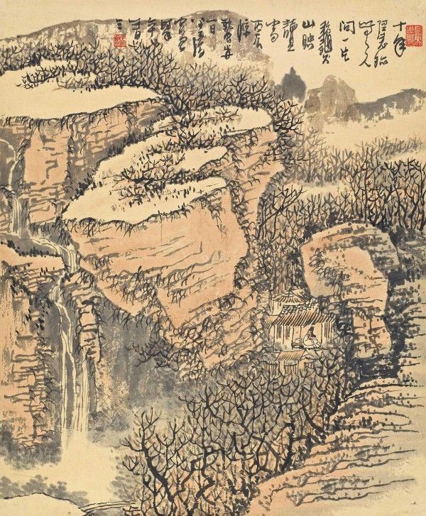黄秋园《隐居读书》作品介绍:纸本,立轴,设色;纵67.8厘米,横56.8厘米;作于1976年;藏于不详;题识:十年隐迹无人问,一片秋山映读书。丙辰惊蛰前一日,半个僧画,时年六十有三;钤印:半个和尚、长留天地间。