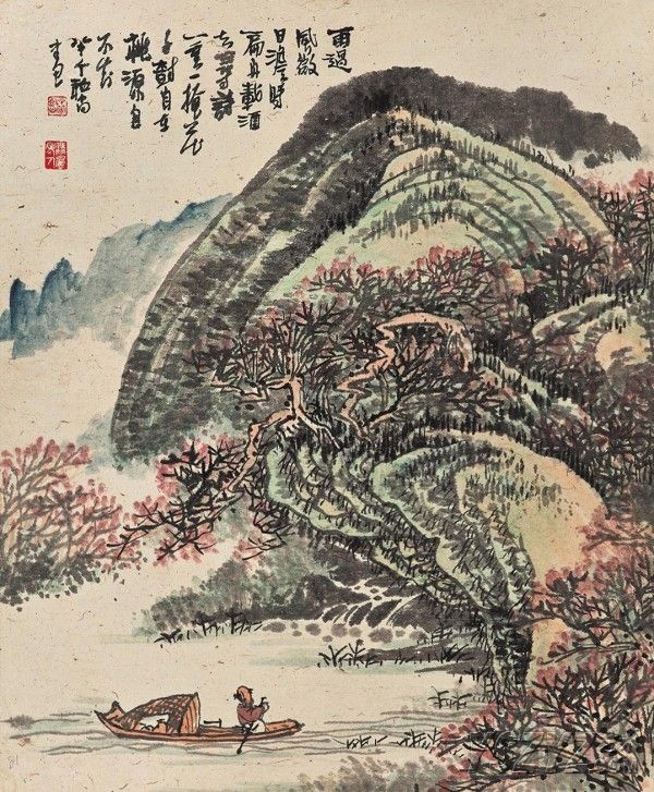 黄秋园《桃溪泛棹》作品介绍:纸本,立轴,设色;纵64.5厘米,横53厘米;藏于不详;款识:雨过风微日淡时,扁舟载酒去寻诗。一重一掩花千树,自在桃源自不知。半个和尚画;钤印:「半个和尚」、「清风老人」。