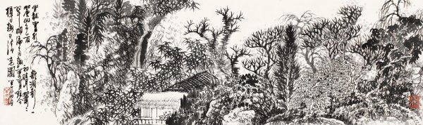黄秋园《云山幽居》作品介绍:纸本,镜片,水墨;纵28.5厘米,横95厘米;藏于不详;题识:坐听书声杂涧声,一帘山色雨初晴。潇潇翠竹偏多趣,更有琴樽趣又清。老园半丁僧;钤印:半丁僧、长留天地间。