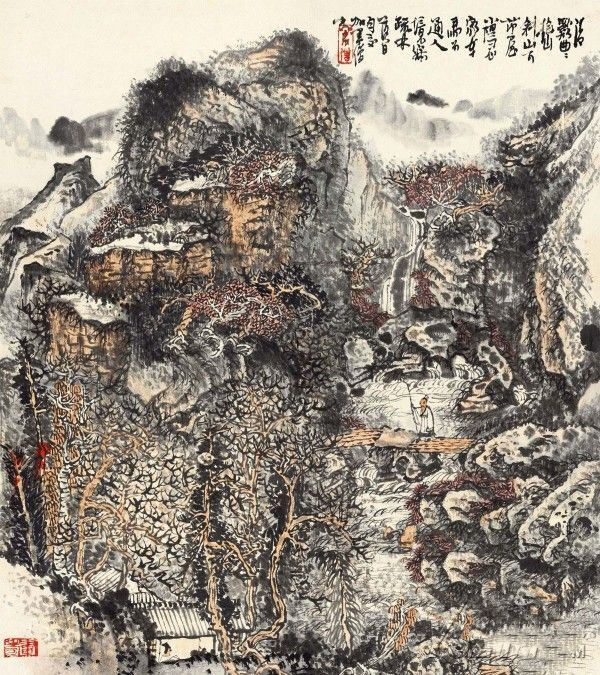 黄秋园《清溪茅屋隐》:此作为黄秋园先生的代表作品之一,为其郁密深厚一路风格的作品。作品画面采用方形的幅式,构图饱满充实,于平正中求变化。在整幅的勾皴点染中,强化了墨的韵味。反复多次地运用干、湿、浓、淡之墨,层层叠加,纵横交错。最有特色的是此幅积墨山水中运用了工笔山水中所常用的“鬼面皴”,这是在其积墨山水中绝无仅有的。画中远山近石和草丛树木的过渡处,常以重墨醒之,以增加层次感。部分墨线反复勾勒,或繁而不乱,或乱中求理,处处见笔,出处见墨,苍茂而空灵。纵观全面,整体感强,气势大,意境深邃,一片点和线的交响世界。