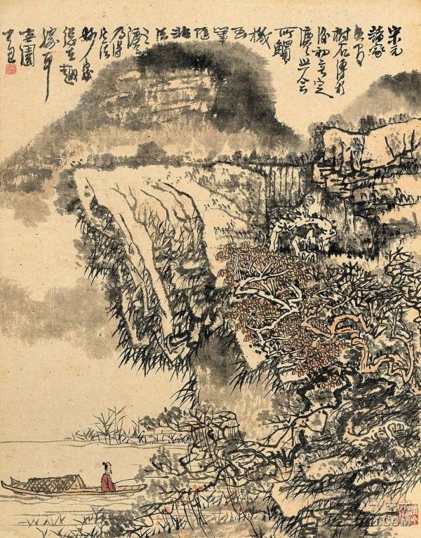 黄秋园《江湾垂钓图》:此作为黄秋园先生郁密深厚一路风格中的代表作之一。画面采用近于方形的幅式,构图饱满充实,有现代感。作品充分展示了中国画的笔墨精神,在整幅的勾皴点染中,强化了墨的韵味,较多地使用了积墨法。作者吸收了黄宾虹的积墨法,但有所变化和发展。画中反复多次地运用干、湿、浓、淡之墨,层层叠加,纵横交错。远山近石和草丛树木,常以重墨醒之,以增加层次感。部分墨线反复勾勒,或繁而不乱,或乱中求理,处处见笔,出处见墨,苍茂而空灵。纵观全面,整体感强,气势大,意境深邃,一片点和线的交响世界。