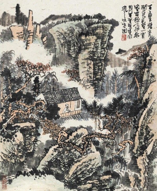 黄秋园《一窗风雨听飞泉》作品介绍 :纸本,立轴,设色;纵64厘米,横53厘米;藏于不详;题识:百叠烟霞开绝壑,一窗风雨听飞泉。闭门弄笔颇得闲适之味。老园 ;钤印:秋园老人;藏印:流泉山房珍藏近现代书画印记。
