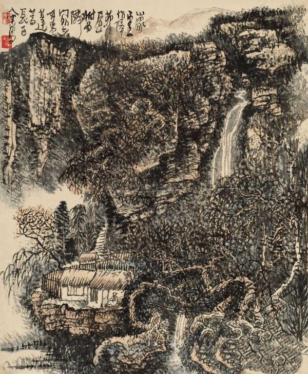 黄秋园《山家茅屋图》:此作面布局精巧,以色补墨,淡赭渲染,把深秋的凉意和萧瑟都展露无遗。画面中虬松交枝错叶,穿插有致,自画面的右下方拔地而起,一直延伸到画面的中间部分,松树前实后虚,笔墨层次分明。临水有一屋舍,中有一人独坐。水景用留白来表现,不着一笔,却感觉静水深流,流淌不息。各种树木遍布山腰,虚实相间,浓淡交错,画面自然生动,不为法拘。构图上采用了“截取法”,从中间局部取景,画中景物层叠、树木茂密,画笔以浑朴深厚,苍苍莽莽的线条,描绘出茂密的树木和各具形态、枝叶茂密、错落有致的树石。在笔墨技法上,山石横直交错,秀灵而坚实,错落的苔点,使山势更显苍莽,墨色干湿浓淡恰到好处或用流畅而凝重的中锋线条,或用干毛而松柔的侧锋线条先勾出山体的轮廓和脉络,以表现山峦的凹凸和体积感,其笔墨基本属于大涤子一脉的笔调。整幅画气魄雄伟,恣肆奔放,刚劲雄浑,沉着痛快,达到了力辟混沌的自由境界。水墨把握极佳,缜密空灵,苍润兼济,耐人回味。作者善用墨法,枯湿浓淡兼施并用,尤喜用湿笔,通过水墨的渗化和笔墨的融合。运笔灵活,或细笔或粗笔,多方拙之笔。画作构图新奇,笔情恣肆,淋漓洒脱,不拘小处瑕疵,具有一种豪放郁勃的气势,以奔放之势见胜。